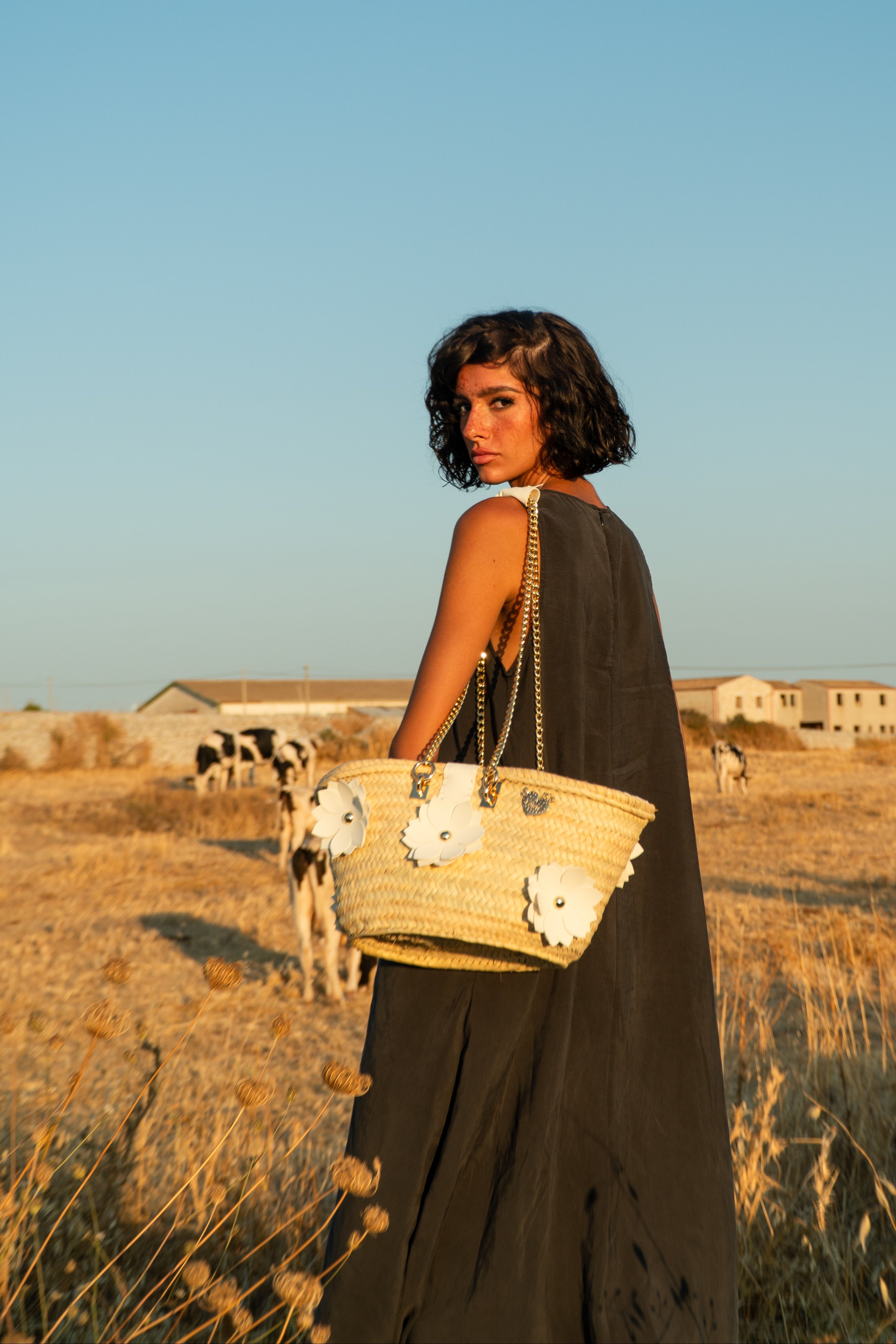 Una celebrazione sostenibile della natura e dell’identità, tra artigianalità siciliana e design contemporaneo. Collezione di borse in palma intrecciata a mano, arricchite da fiori in pelle vegetale bio-based da scarti di arancia e fico d’India.