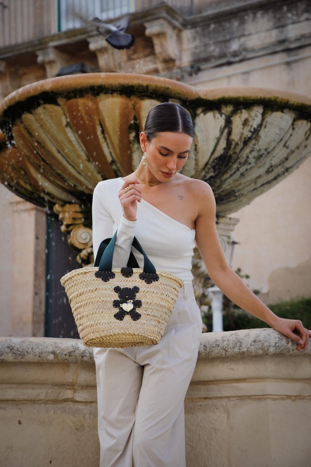 Ogni pezzo è realizzato a mano in palma nana, con dettagli e grafiche che raccontano la Sicilia in chiave contemporanea, tra cultura, moda e originalità.
