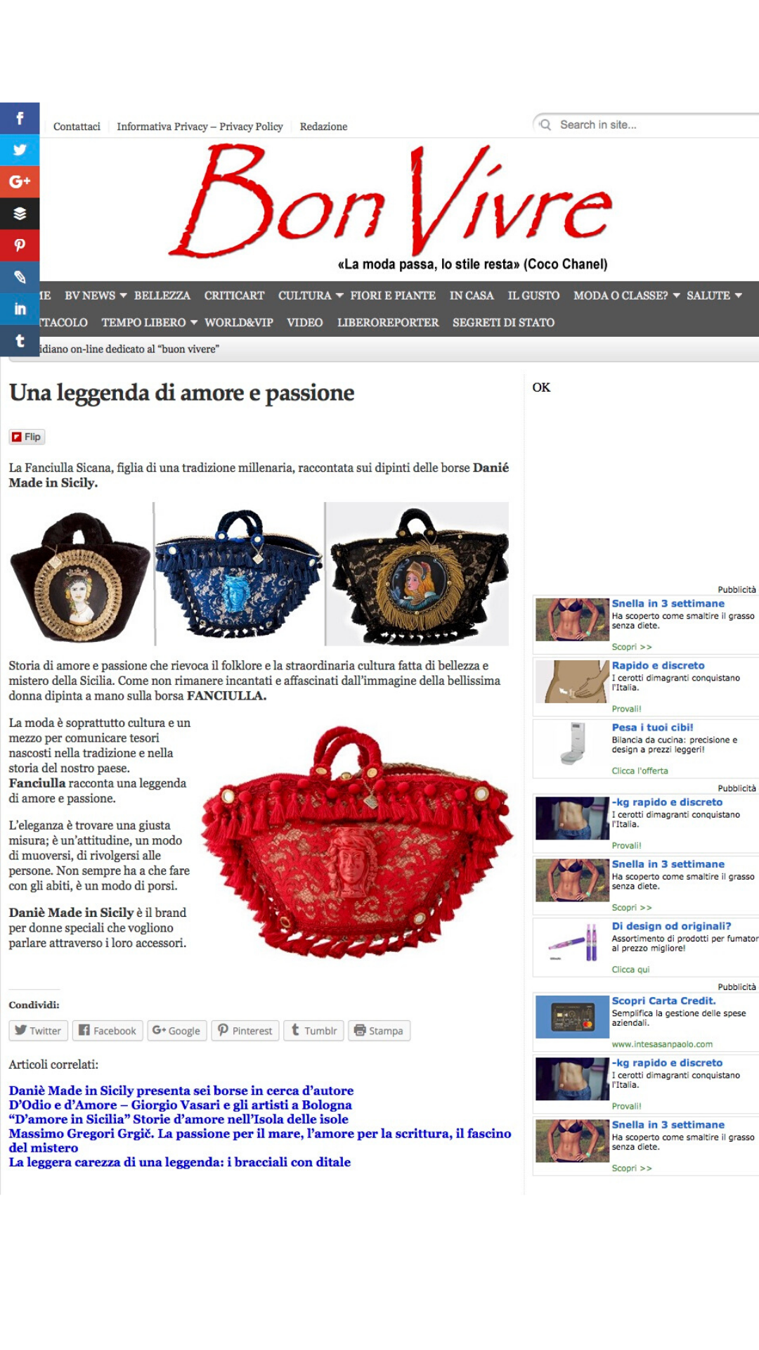 Danié is among the protagonists of Bon Vivre , the magazine dedicated to the beautiful, the good and the authentic Italian way of life. The artisanal creations of the Sicilian brand, including handmade bags and accessories, tell of an elegant and genuine Sicily, made of colors, traditions and timeless quality. An award that celebrates the sophisticated and deep-rooted soul of Danié.