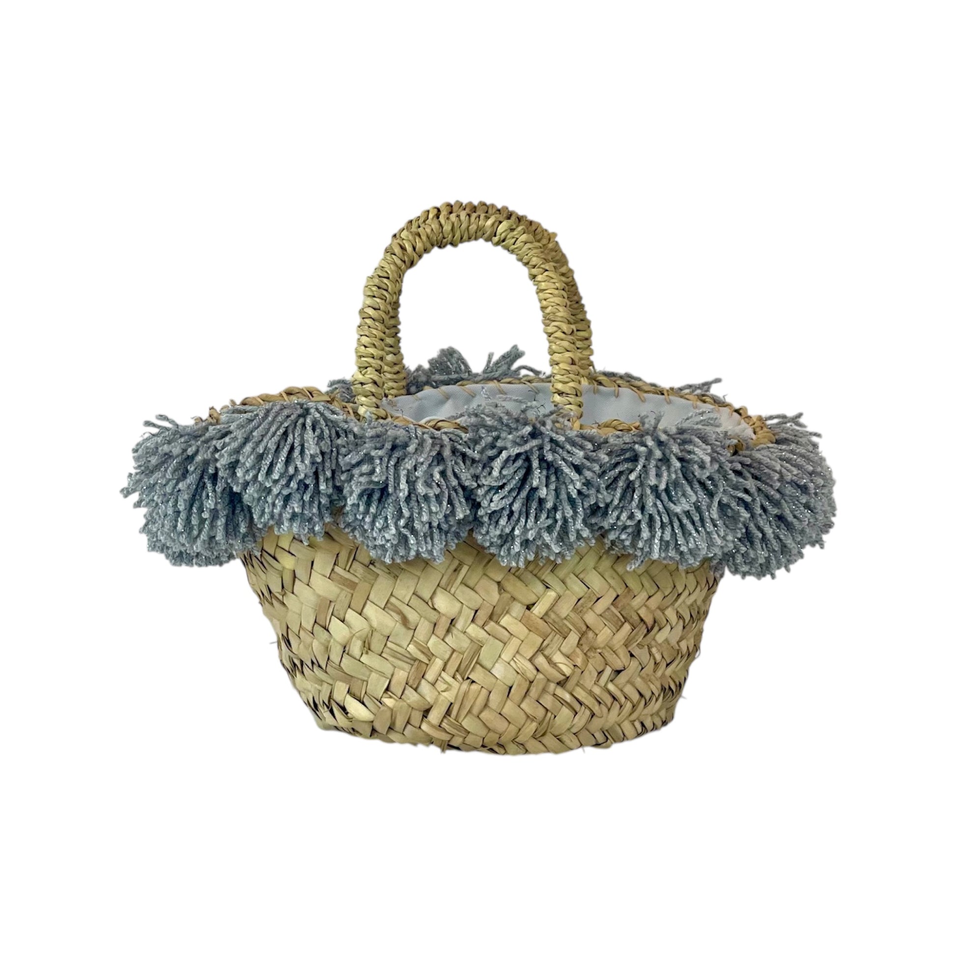 Elegant and bright, this dwarf palm basket is embellished with a hand-painted ceramic wheel in the center and silver cotton pom poms. Perfect for adding an artistic and traditional touch to any outfit. Finished with recycled leather handles and canvas interior fabric.