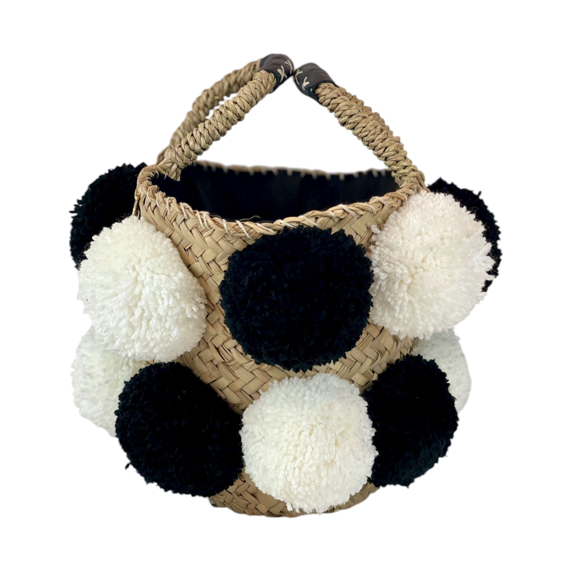 Questa coffa media è realizzata in palma nana intrecciata, decorata con pon pon handmade in lana bianco e nero, per un design elegante e contemporaneo. Interno in tessuto di tela e manici in ecopelle riciclata. Un pezzo unico, fatto a mano in Sicilia.