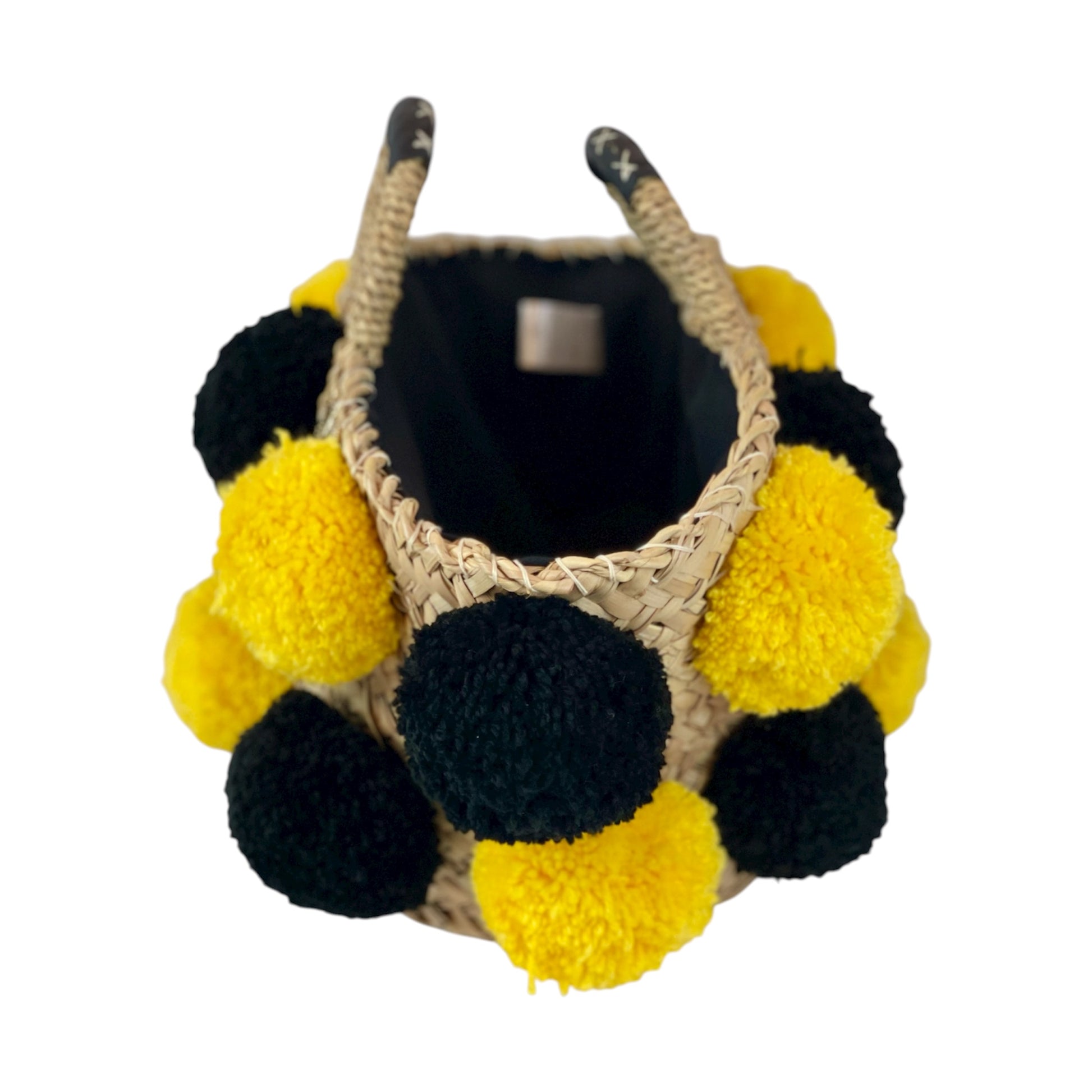 Questa coffa media in palma nana intrecciata è decorata con pon pon handmade in lana nei toni giallo e nero, che creano un contrasto dinamico e solare. L’interno è rifinito in tessuto di tela resistente. Manici in ecopelle riciclata completano la borsa, rendendola perfetta per chi ama un accessorio vivace e sostenibile. Ogni pezzo è fatto a mano in Sicilia con attenzione ai dettagli.