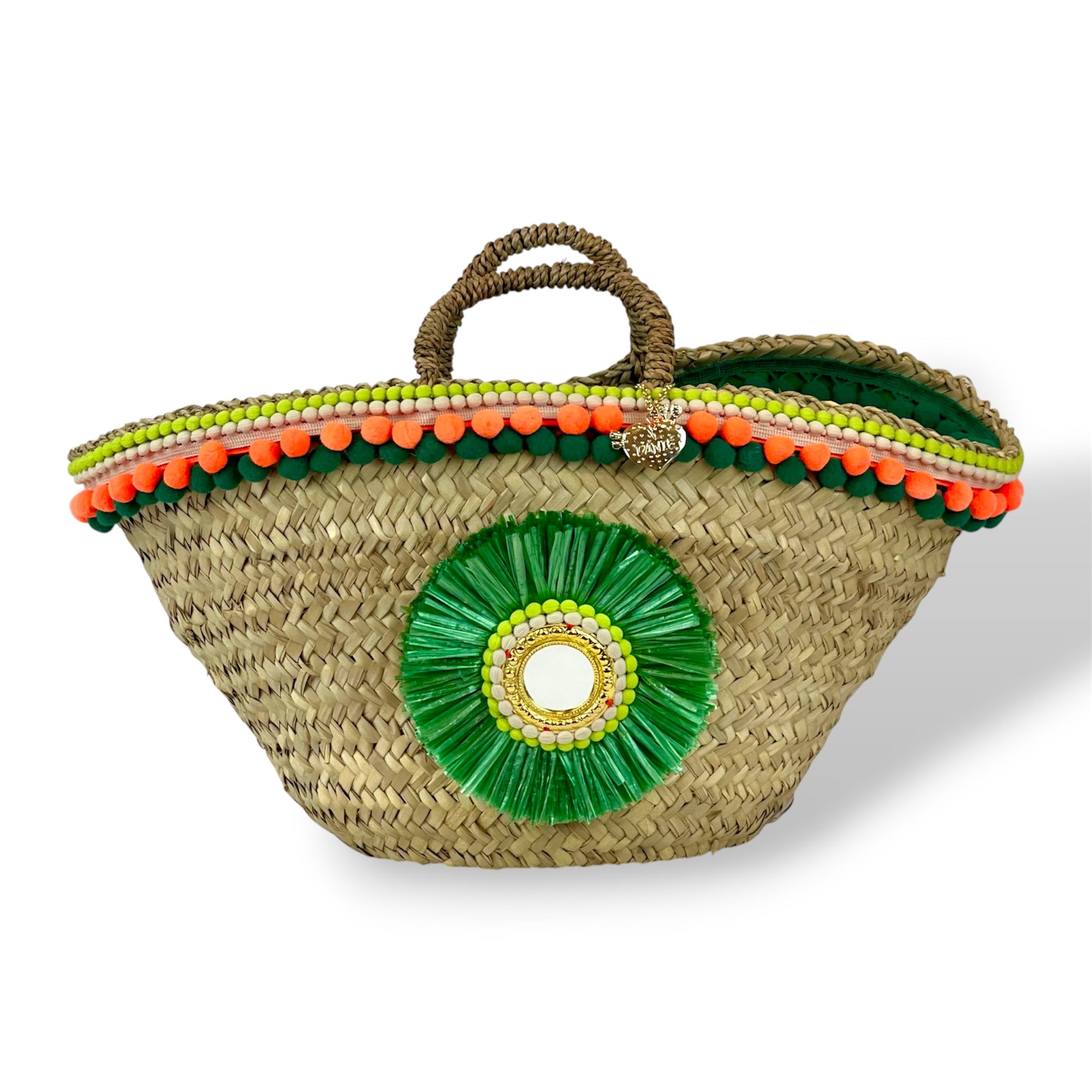 Questa coffa grande in palma nana è impreziosita da un fiore artigianale in rafia verde sul davanti, con un piccolo specchietto centrale bordato in metallo oro. La parte superiore è decorata con passamaneria di pon pon multicolor verdi e arancioni. La fodera interna è in poliestere. Una borsa dal sapore siciliano autentico, perfetta per chi ama l’artigianato fatto a mano con un tocco di colore fresco e raffinato.