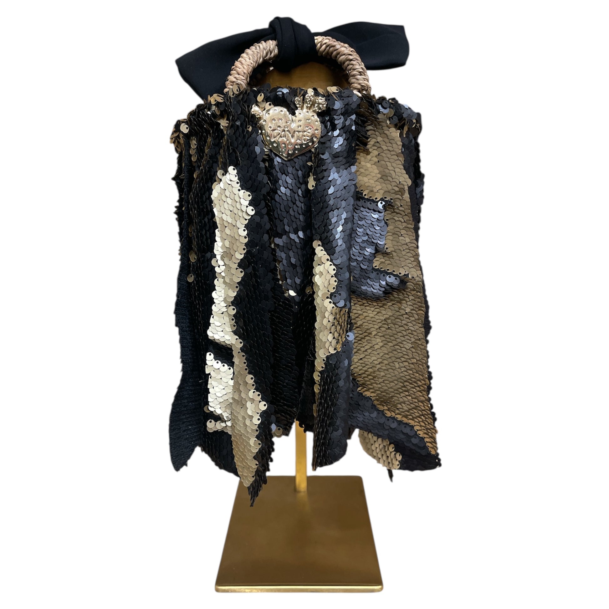 Mini coffa intrecciata a mano in palma nana, con applicazioni in tessuto di paillettes nero e oro opaco riciclate. Interno in tela. Artigianato siciliano luminoso e sostenibile.